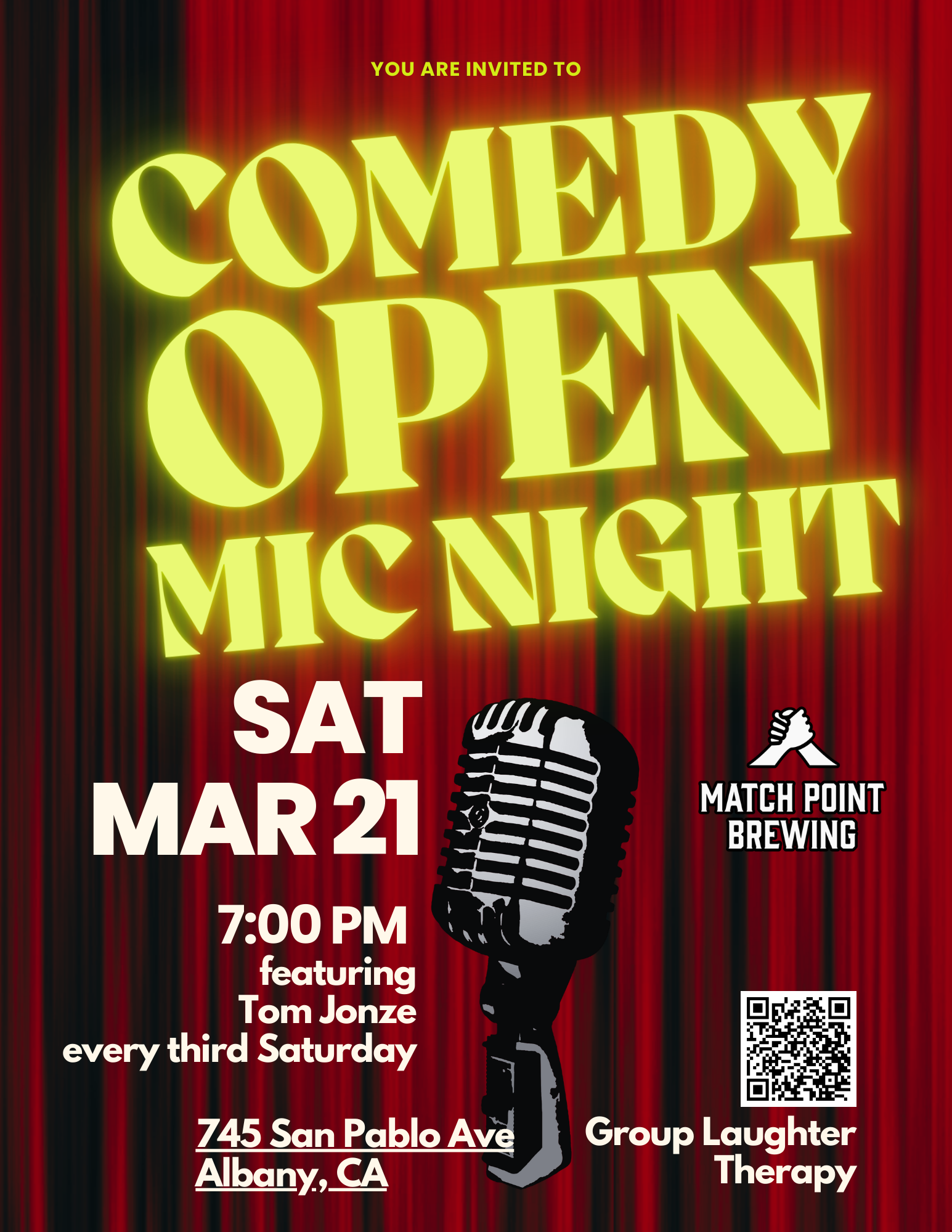 Got jokes? Whether you're a seasoned comic or a first-timer, our comedy open mic is the place to shine. Bring your best (or worst) and make us laugh—no pressure, just good vibes. We will try our best to accommodate everyone, so help us organize the schedule by signing up online below or with in person sign ups 30 minutes before the show are preferred.